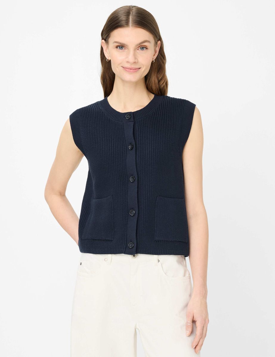 Ein absolutes Fashion-Statement setzen Sie mit dem Pullunder im Style ELISA, der aktuellen Trends eine entspannte Note verleiht. Dieses ärmellose Strickteil überzeugt durch einen Rundhalsausschnitt und eine gerade, leicht verkürzte Form, die eine moderne und zugleich lässige Silhouette zaubert. Besonderes Augenmerk verdient die durchgehende Knopfleiste, die dem Strickpullunder eine vielseitige Note gibt und verschiedene Trageoptionen eröffnet, ob geschlossen getragen oder lässig offen über einer Bluse. Praktische aufgesetzte Taschen unterstreichen den unkomplizierten Look und feine Minderungsdetails an den Kanten unterstreichen die hochwertige Verarbeitung, die dem Damenpullunder eine edle Struktur verleiht. Dieses durchdachte Design trifft auf reine Baumwolle, die pures Wohlgefühl verspricht. Die natürliche Faser schmeichelt der Haut und sorgt für einen soften Griff sowie angenehmen Tragekomfort, was diese vielseitig kombinierbare Strickweste zu einem unverzichtbaren Favoriten macht, der sich mühelos von lässig bis chic stylen lässt.