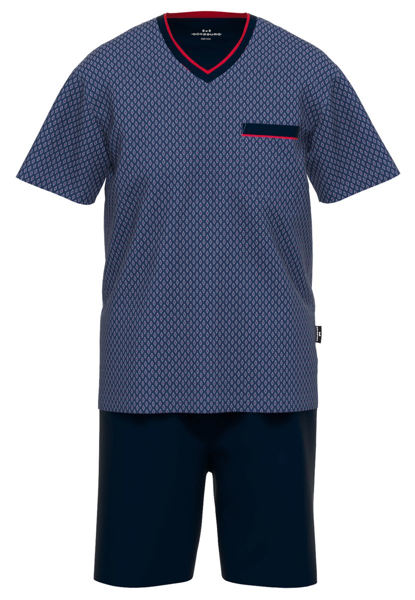 Komfort trifft auf Stil: Der kurze Schlafanzug von Götzburg überzeugt mit klassischem Design und angenehmem Tragegefühl. Das gemusterte Oberteil mit V-Ausschnitt und kontrastierendem Detail an der Brusttasche sorgt für einen modernen Look – ideal für warme Nächte und entspannte Stunden daheim.
