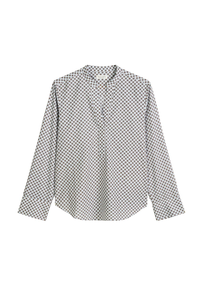 Sportlich & elegant: die Bluse mit modernem Allover-Print aus reiner, zertifizierter Bio-Baumwolle in glatter, leichter Papertouch-Qualität. Lässiger, leicht ausgestellter Regular Fit mit Stehkragen, V-Ausschnitt mit Blenden-Verarbeitung, klassischen Blusenärmeln mit breiten Manschetten und abgerundeter Saumlinie. Für den entspannten Freizeitlook zur Lieblingsjeans, Sneakern und Cardigan kombinieren.