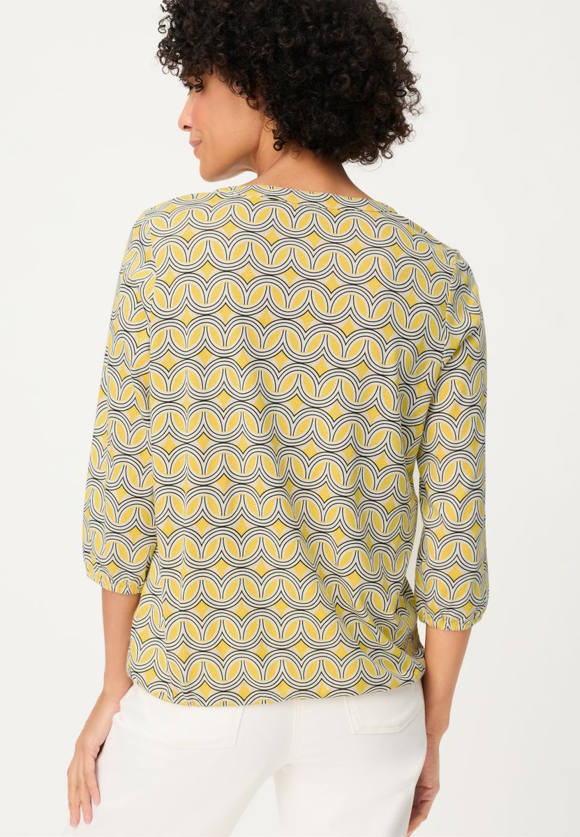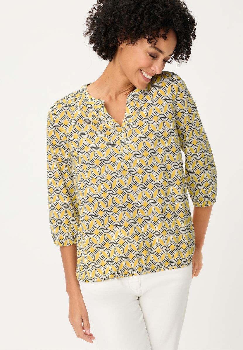 Dieses T-Shirt begeistert mit seinem stilvollen Allover-Dessin, das dem Look eine moderne und feminine Note verleiht. Der tunikaähnliche Ausschnitt setzt einen charmanten Akzent und unterstreicht die legere Ausstrahlung. Mit 3/4-Ärmeln und elastischen Abschlüssen sorgt das Shirt für hohen Tragekomfort und eine schmeichelhafte Passform. Dank der Olsen-Passform „Clara“ sitzt es figurumspielend und bietet angenehme Bewegungsfreiheit, ohne einzuengen. Weiterer Pluspunkt: TENCEL™ Modalfasern unterstützen langanhaltende Weichheit und werden aus dem natürlichen Rohstoff Holz gewonnen. TENCEL™ ist eine Marke der Lenzing AG. Länge ca. 60 cm.