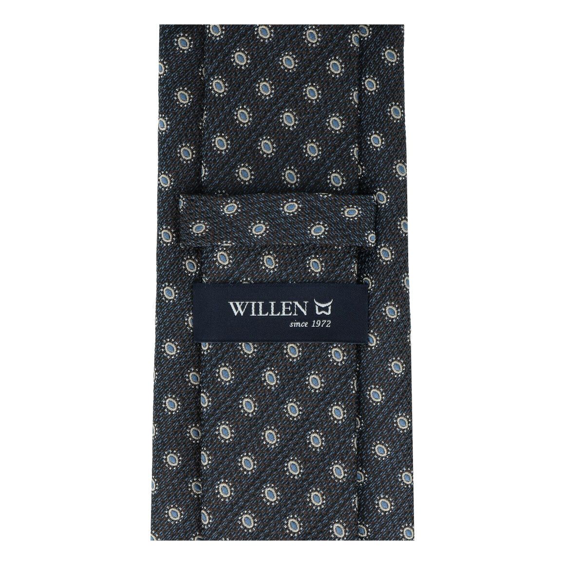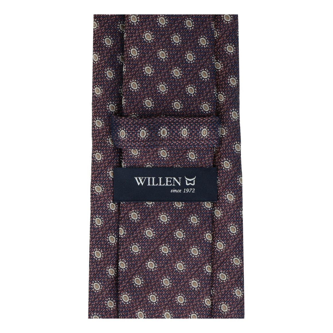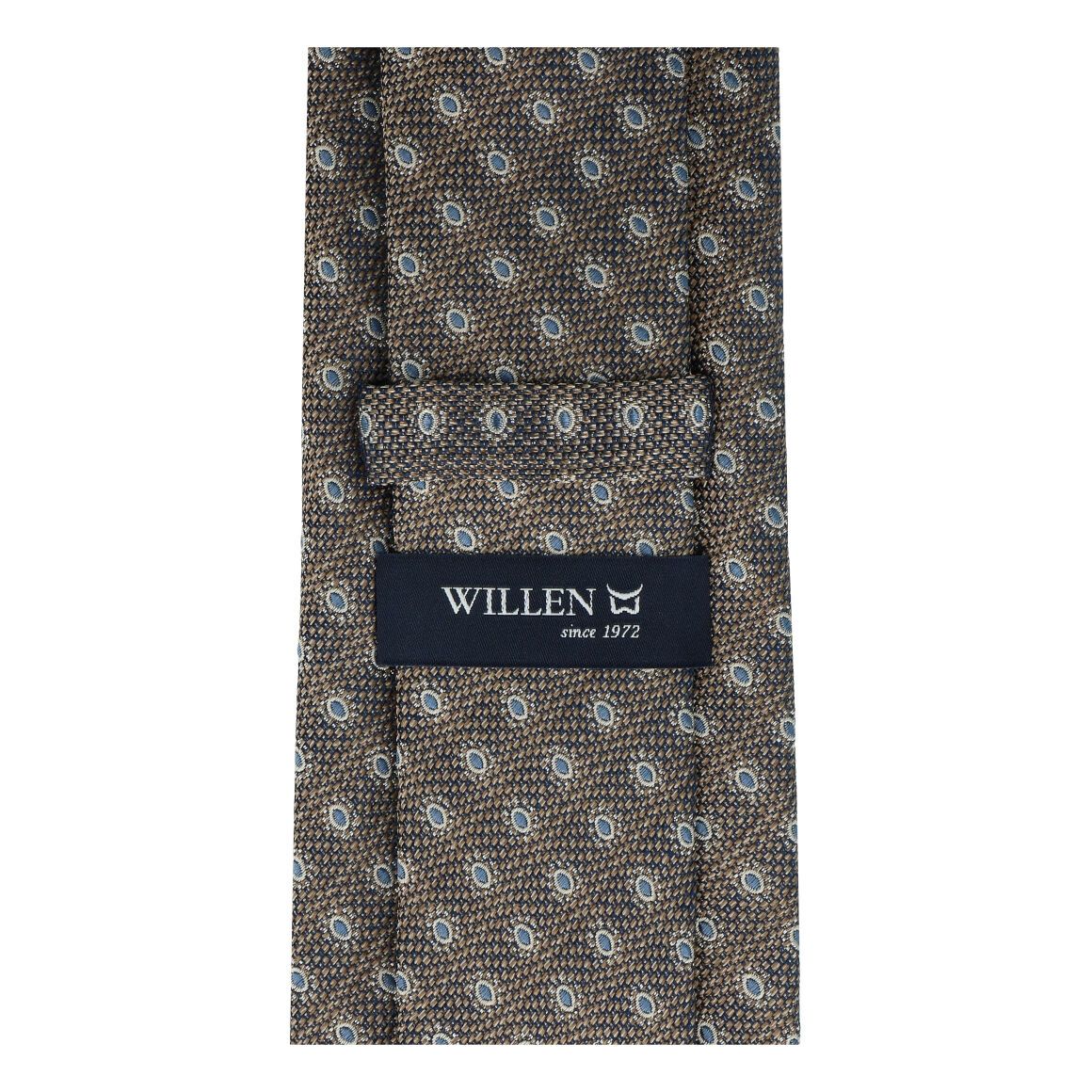 Die hochwertigen Willen Krawatten bestechen nicht nur durch ihr Design in Stoffen aus 100% Seide, sie werden in traditioneller Verarbeitung von Hand vollendet. Das Herzstück der Krawatte bildet die beidseitig aufgeraute Einlage, die sowohl in Gewicht, als auch im Zuschnitt perfekt auf den Seidenstoff abgestimmt wird. Eingebettet in einem zarten Viskosestoff, verleiht die Langfütterung der Willen Krawatte einen zusätzlichen Qualitätsstandard. Die drei Lagen Komponente gibt der Krawatte Volumen und Elastizität, sie sorgt für minimale Faltenbildung und optimale Knotenstabilität. Ein im ,,Self-Design‘‘ gefertigter Passantino ziert die elastische Längsnaht der Willen Krawatte.